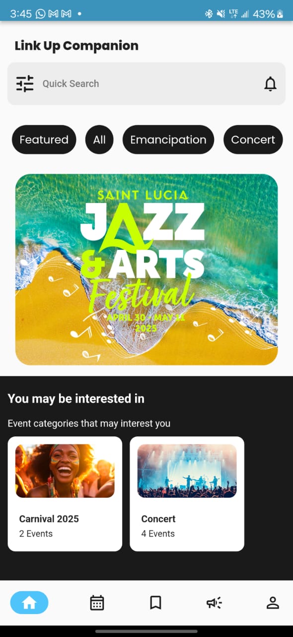 Link Up Companion aims to connect people to the vibrant pulse of local events across Saint Lucia and the Caribbean. By making it easy to discover, share, and attend activities, the platform empowers both attendees and organizers. Through intuitive design, event promotion tools, and integrated ticketing, we bridge communities with experiences that matter. Our mission is to ensure that no moment is missed and that there’s always something to do, wherever you are.